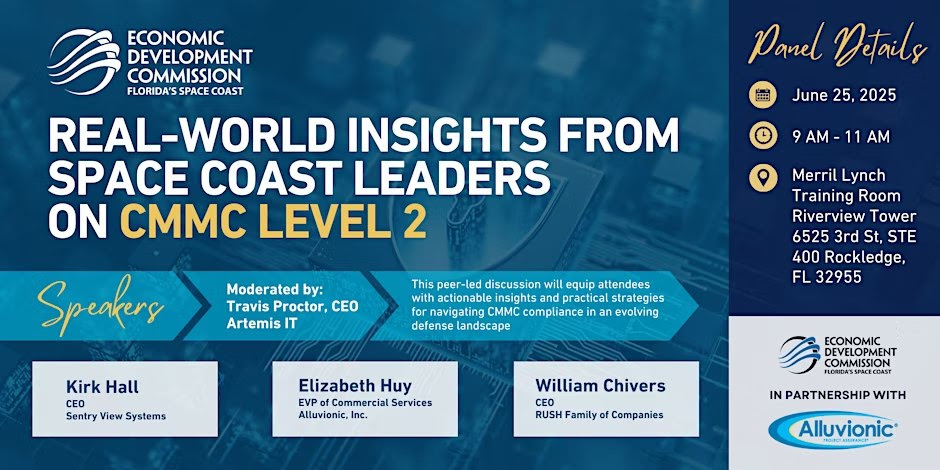 RUSH was proud to join the panel discussion: “CMMC Level 2: Real-World Insights from Space Coast Leaders” hosted by the Economic Development Commission of Florida’s Space Coast and Alluvionic Inc on June 25, 2025 in Rockledge, Florida.